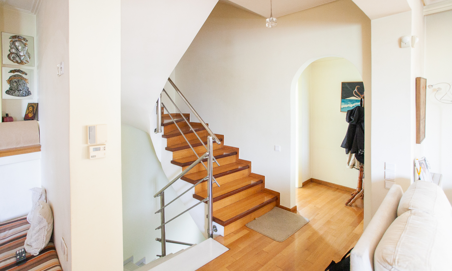 Near Merkouri square, airy, meridian, modern construction, consisting of the following apartments: ground floor. parking space, storage room, wc, 1st floor, 80sqm 1 bedroom, opens pace kitchen-living room, bathroom, spacious balcony with bbq, 2nd-3rd floor mezonette with 3 bedrooms, 2 bathrooms, open plan living/dining room-kitchen with fireplace, spacious veranda with awnings and nice view, and 80sqm terrace with panoramic view (Filopappou and Lycabettus hill), with elevator, aluminum double glazing windows, security doors, autonomous heating with oil. ideal for Airbnb. The property is located in a great area, next to Filopappou hill and easy access to the Historical center.